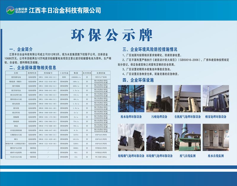 江西豐日冶金科技有限公司成立于2012年3月,注冊資金15000萬元,現(xiàn)為山東環(huán)保集團旗下控股子公司,落戶于江西省宜春市袁州醫(yī)藥工業(yè)園。公司年回收再生十萬噸廢舊鉛酸蓄電池項目占地62.41畝,總建筑面積42180㎡,總投資3.5億元,于2020年5月份投入生產,自生產以來運行穩(wěn)定,年產值達10億元以上,年納稅1億元以上。